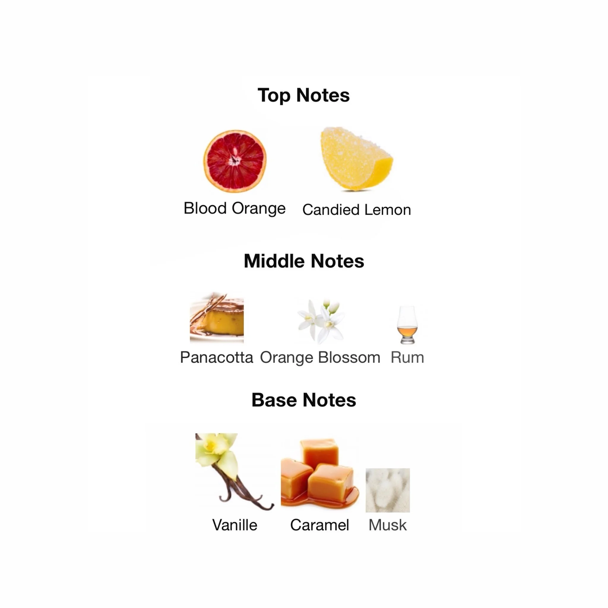 It opens with an irresistible brightness: blood orange and candied lemon melt together like sugared sunlight, sweet but sophisticated, full of life and lift. As it settles, the heart unfolds in waves of creamy pannacotta, delicate orange blossom, and a drizzle of smooth rum — a scent that dances between indulgence and elegance. Finally, the base lands softly, grounded in comfort and allure: vanilla hums with warmth, caramel melts like gold across the skin, and musk lingers in a soft, sensual embrace.